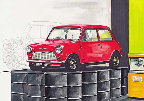 during the event I painted the 1960 mini, which is in Coventry's Transport Museum. Looking at this car all the details come back to me of the original mini: the sliding windows, the Morris bonnet badge, the minimalist Issigonis lines. Wonderful!