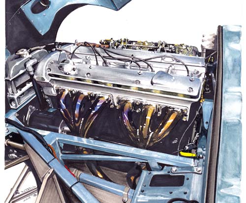 commemorating aspects of my work from 1968 to the present day - lunch in the E-Type bodyshell(!), working on the Jaguar XK assembly line, traditional draughtsmanship to draw the engine, marker rendering from my styling period and gouache painting from my current watercolour period!!
