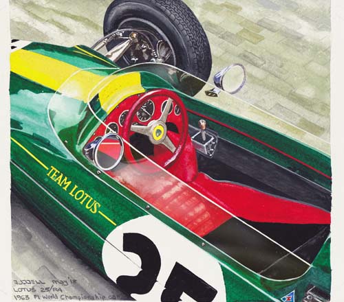 capturing the iconic colours of Team Lotus with my watercolour of the car that will always be associated with double world champion Jim Clark, Lotus 25/R4