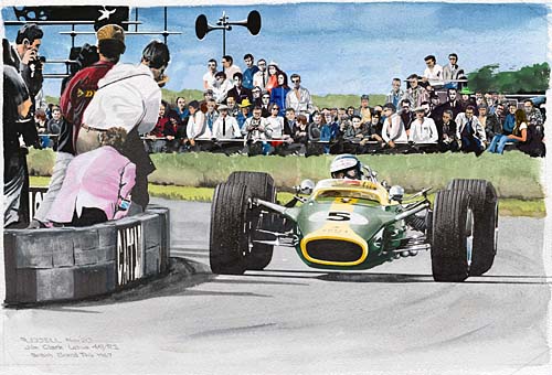 Jim Clark winning the British Grand Prix. My painting of the sublime Lotus 49/R2 at Copse corner Silverstone 1967