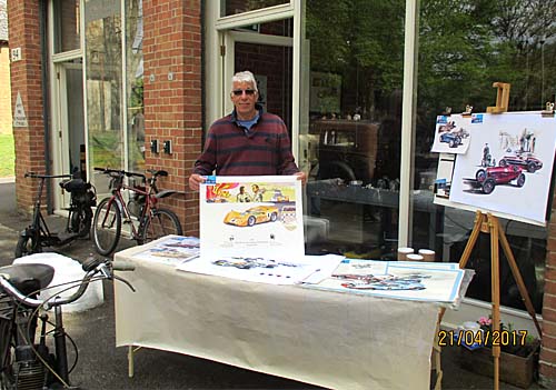 cliff and his cars . . . or cliff and the cars he has drawn!! Selling my artwork at one of Bicester Heritage's Sunday Scramble events