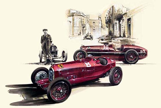 Alfa P3, P2 and their designer Vittorio Jano. Another fade to sepia drawing done in marker and pastel. Background is Campofelice and the 1930 Targo Florio.