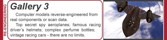 Ruddell Art Gallery 3: Computer models reverse-engineered from real components or scan data. Top secret spy aeroplanes; famous racing driver's helmets; complex perfume bottles; Gilbert-Scott church renovations; vintage racing cars - there are no limits.