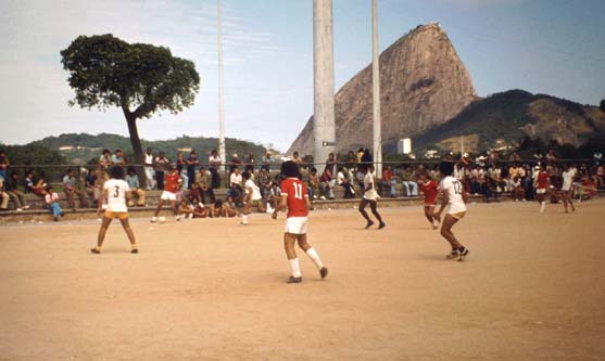 an impromptu football match in the shadow of the Sugarloaf mountain