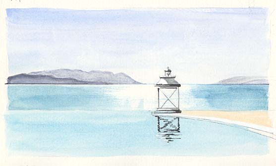 the sun sinking behind the Greek Island of Samos reflecting into the infinity pool in the foreground. Painting based on a photo I took with the camera actually sitting on the ground!