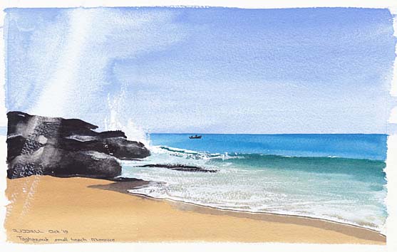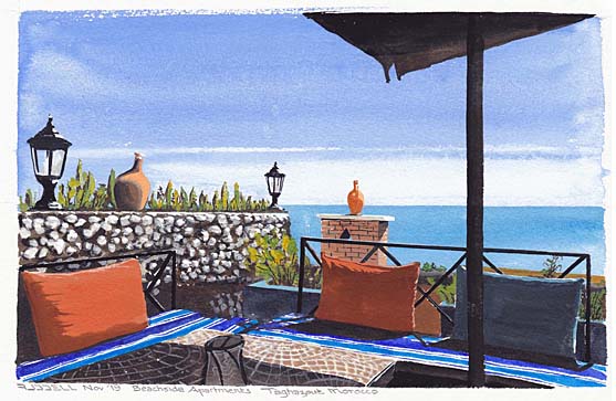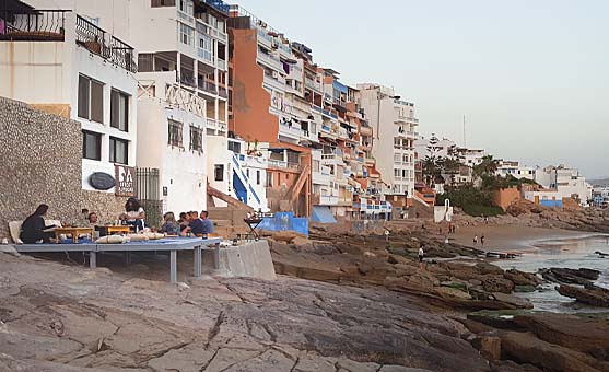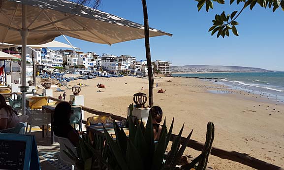 Beachside cafe in Taghazout, a small fishing village in southwestern Morocco, where blistering October sunshine, fishing boats and camels on the beach tell you that this is not England