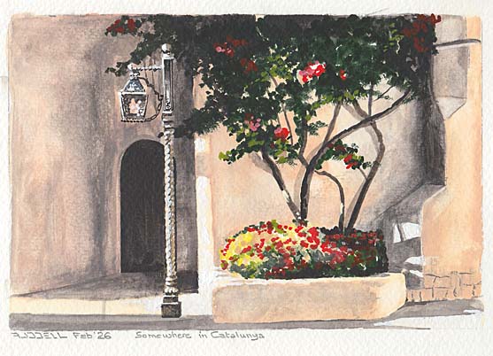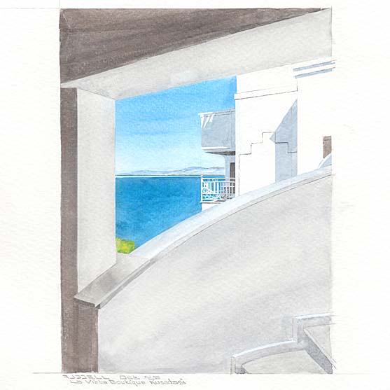 we were sitting under the shade having lunch and I thought "that would make a nice picture" so I had another coffee and painted this. The handrail and glass balcony were touched up in Photoshop after scanning