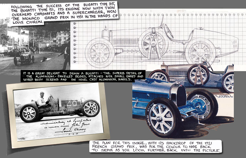 It is a great delight to draw a Bugatti – the superb detail of their aluminium-panelled bodies, body panels attached with small eared and wired body screws and their novel cast aluminium wheels. Every component was meticulously crafted!