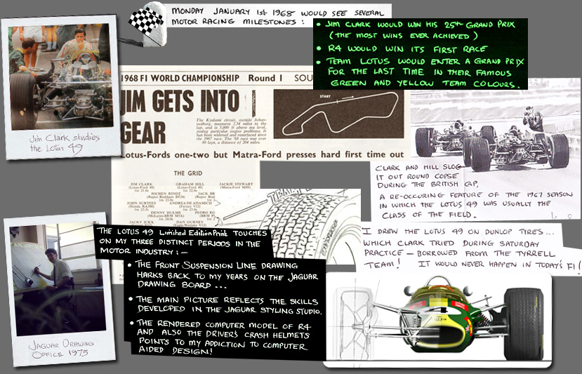 The Lotus 40 Limited Edition Print touches on my three distinct periods in the motor industry: The front suspesion line drawing harks back to my years on the Jaguar drawing board; the main picture reflects the skills developed in the Jaguar Styling Studio; The rendered computer model of R4 and also the driver's helmets points to my addiction to Computer Aided Design!