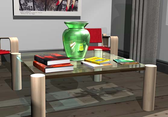 The coffe table. Wonderful glass visualisation tools where you control the glass colour, the transparency and the refractivity.