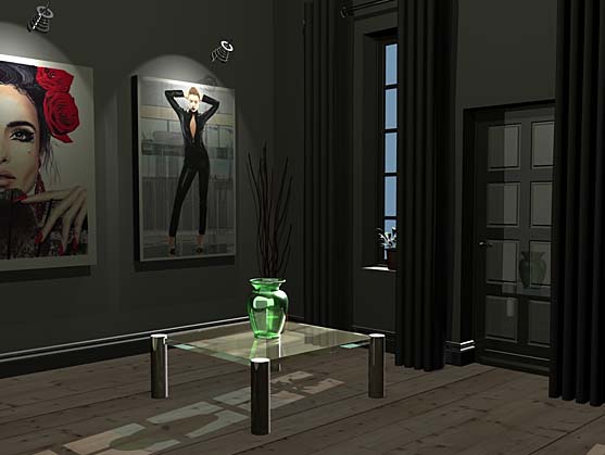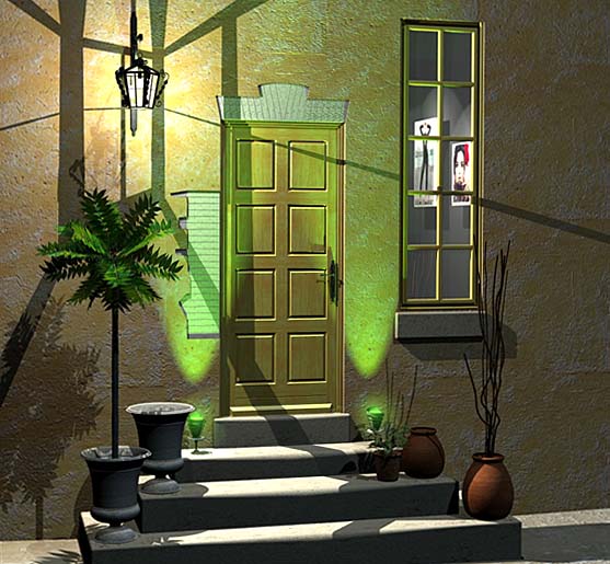 for night-time the sunlight is turned down to a pale moonlight and the wall light and spotlights are switched on. The outside spotlights are specified with incandescence and glow . .