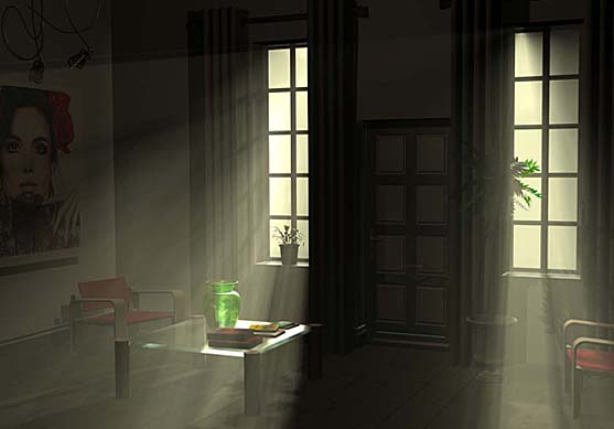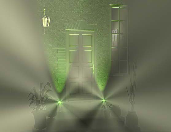 Architectural radiosity, Alias style, using two spotlights texture mapped with solid fractals and linear fog. The interior light is turned very low and has no shadows. A wonderful effect!!