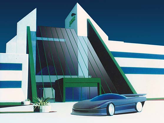A very basic sports car concept, and the new Jaguar Engineering Centre at Whitley, all modelled on Computervision CADDS4X in 1988 . . but rendered within Wavefront on a Silicon Graphics workstation at Wavefront's headquarters in Santa Barbara, California.