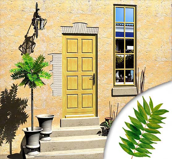 lighting is a compelling feature in Alias Studio: my French house with just a single light representing sunlight (and shade) . . Texture mapping is based on scanned photos for stone and wood texture, but hand painted leaves (inset) for the tree!!