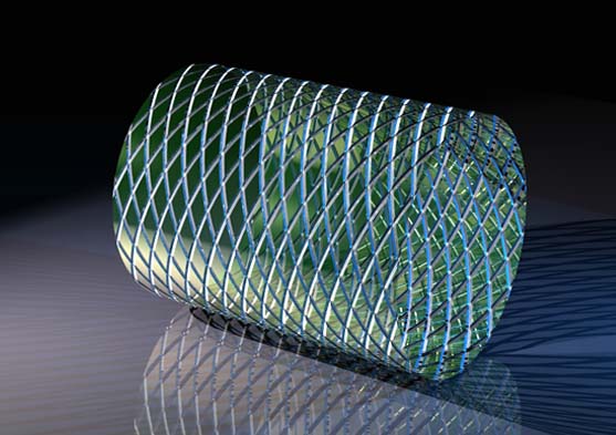 one of the rendering tutorials from Alias AutoStudio Version 11.0.1 which I am re-learning: a plain cylinder with a shader procedure called "ramp" that creates a wire mesh with transparency. Amazing!! some nice reflections and shadows going on here!!