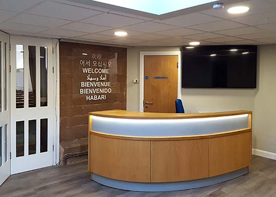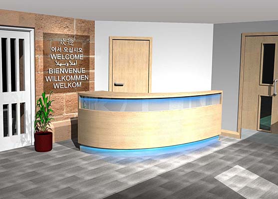 design for a split level welcome desk, plus a multi-lingual welcome sign . . . this visualisation also shows the proposed floor covering and door finishes.