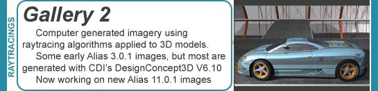 Ruddell Art Gallery 2: Computer generated imagery using raytracing algorithms applied to 3D models. Some early Alias V3.0.1 images but most are generated with CDI's DesignConcept3D V6.10 Now working on new Alias V11.0.1 images.