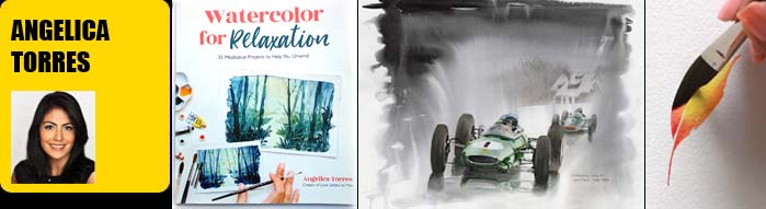 On her Instagram channel Love Letters To Milo I watched Angelica Torres paint a leaf in two colours with one brushstroke - with two colours on her paintbrush - I was astounded! Her wonderful book Watercolour For Relaxation gives many more easy to follow techniques. The rain soaked background in my Jim Clark painting is based directly on one of her tutorials.