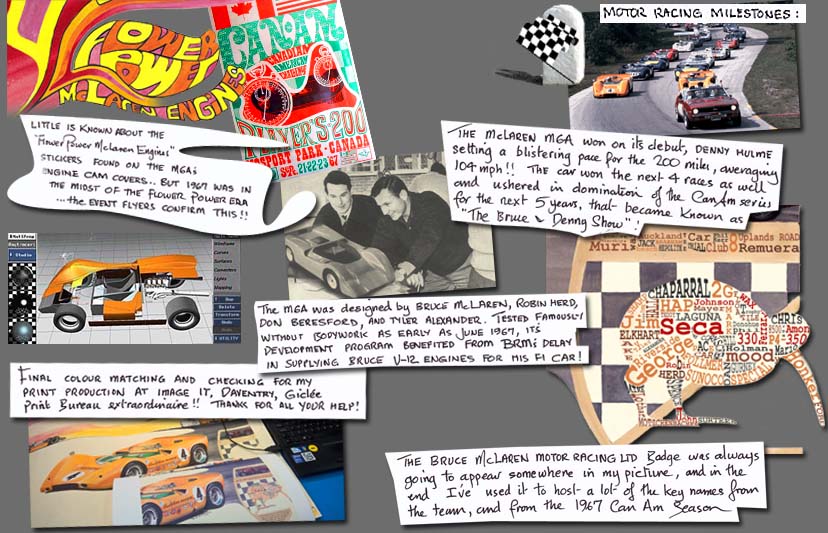 The Bruce McLaren Motor Racing Ltd badge was always going to appear somewhere in my picture, and I’ve used it to host a lot of key names from the team, and from the 1967 Can Am Season.